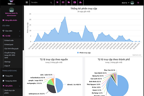 Bạn trở ra bảng điều khiển (Trang chủ) của CMS WebExpress, nếu thấy dữ liệu Analytics đã xuất hiện trên các biểu đồ và báo cáo, tức là công việc kết nối đã hoàn tất.