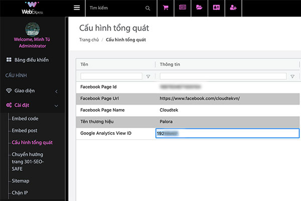 Ở trang CMS thuộc website của bạn, bạn vào phân hệ Cài đặt -> Cấu hình tổng quát -> Tìm đến hàng Google Analytics View ID -> Dán (Paste) View ID vào rồi ấn enter.