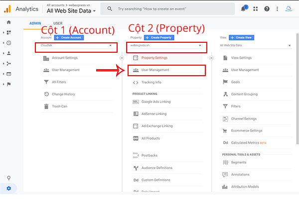 Bạn tiến hành đăng nhập vào tài khoản Google Analytics -> vào Admin (biểu tượng bánh răng ở góc trái phía dưới) -> Ở cột 1 chọn đúng account -> Ở cột 2 chọn đúng property và sau đó click vào User Management (Quản lý user) -> Add user (Thêm người dùng) cos-google-api@cos-project-186707.iam.gserviceaccount.com với quyền hạn Read and analyze (Đọc và phân tích).